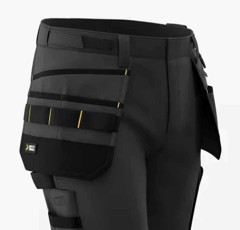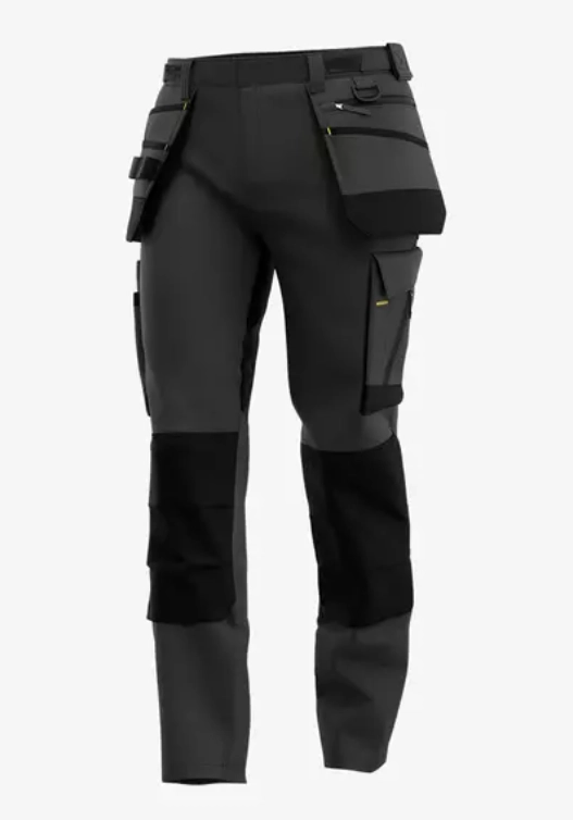 Wygodne spodnie robocze z rozciągliwością w 4 kierunkach, wzmocnionymi elementami, stałymi, wiszącymi kieszeniami i funkcjonalnymi detalami.