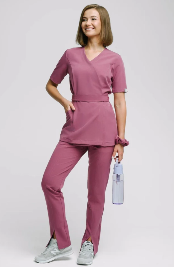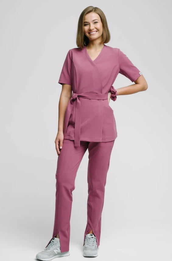 Kobieca kopertowa bluza medyczna uszyta z tkaniny Viscon wysokogatunkowej i miękkiej, z bogatą zawartością splotów wiskozy.