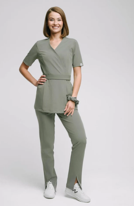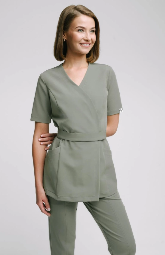Kobieca kopertowa bluza medyczna uszyta z tkaniny Viscon wysokogatunkowej i miękkiej, z bogatą zawartością splotów wiskozy.