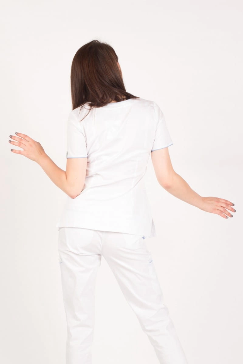 Bluza o nowoczesnym kroju. Uszyta z elastycznego materiału z nowoczesnym wykrojem dekoltu. Posiada cztery kieszenie oraz zaczep na identyfikator. Krój taliowany, wkładana przez głowę.