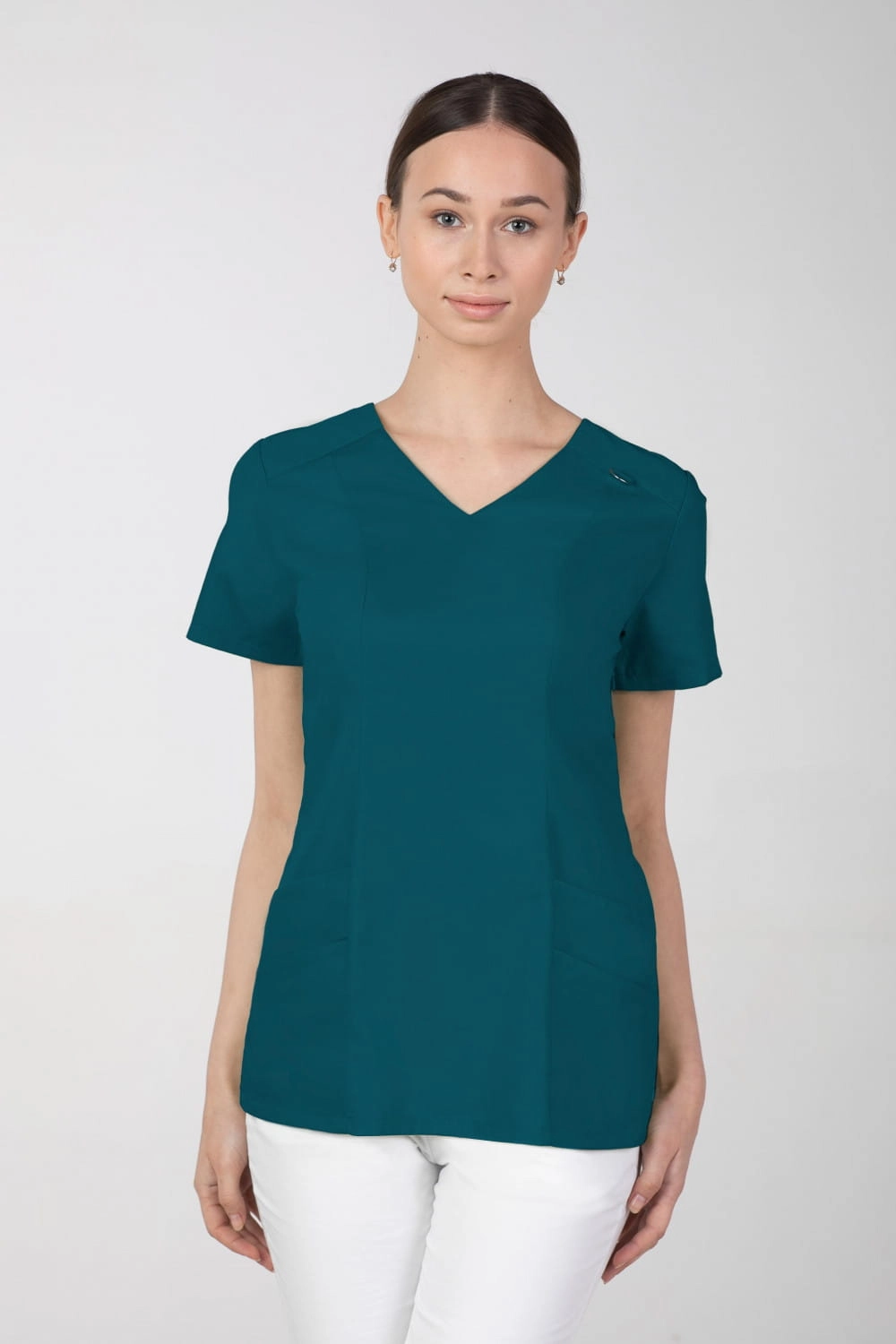 Bluza medyczna damska wkładana przez głowę.