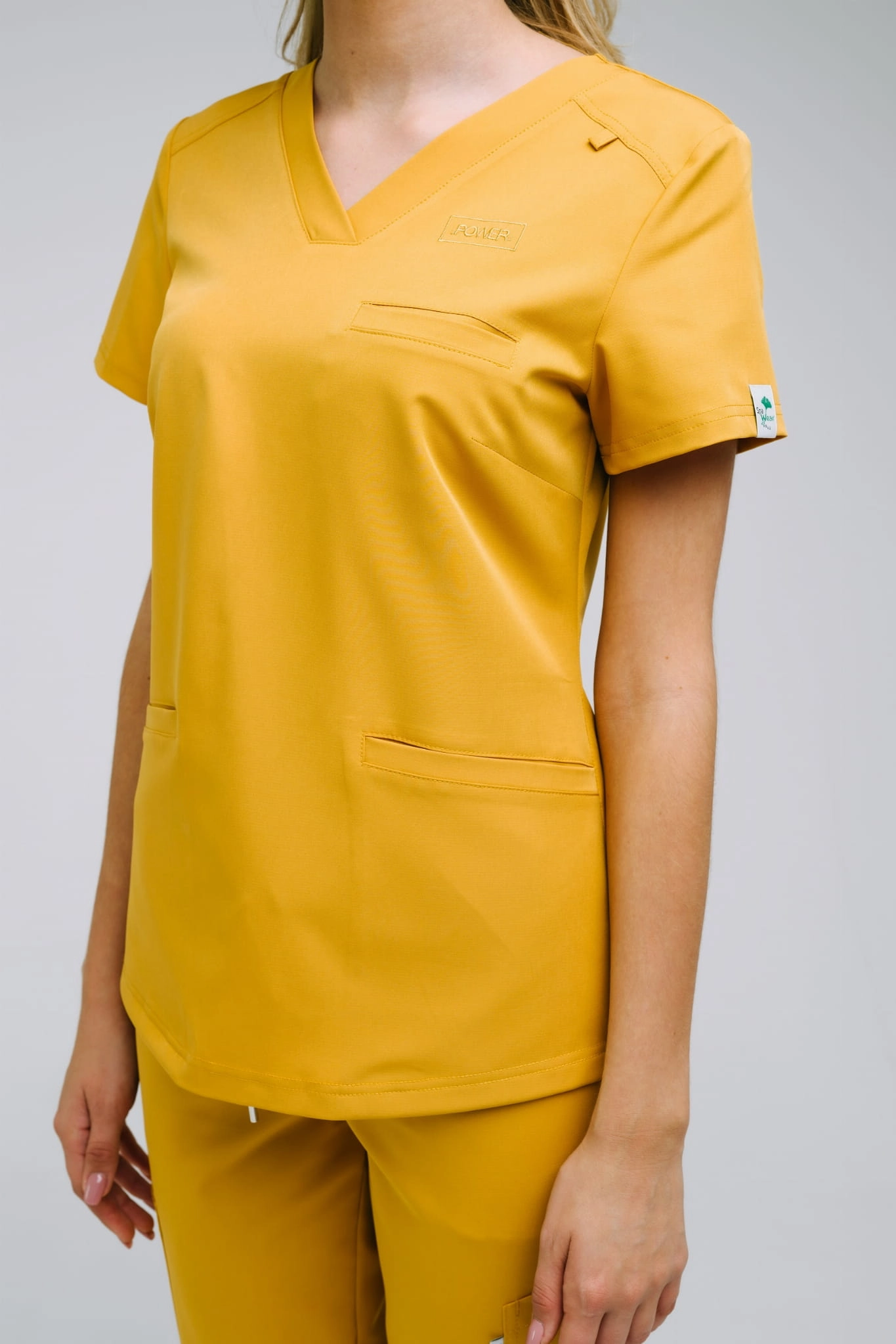 Bluza wykonana z lekkiego i elastycznego w czterech kierunkach materiału. Tkanina w dotyku jest lejąca i chłodnego co sprawdza się idealnego na ciepłe dni. Posiada trzy kieszenie, dekolt w serek, przeszycia na ramionach. Kieszenie są naszywane na wierzch bluzy i dodatkowo zabezpieczone ryglami. Górna kieszeń posiada dodatkowe przeszycie na długopis. Wygląd bluzy dopełniają detale w postaci przeszyć na dekolcie, ramionach, przy zakończeniach rękawków, na dole bluzy oraz kieszeniach. Górna kieszeń posiada wszytą pętelkę do której można przypiąć np. identyfikator. Rozporki na bokach bluzy zapewnią wygodę podczas siadania czy chodzenia. Bluza jest delikatnie taliowana co nadaje fasonowi kształt slim fit.