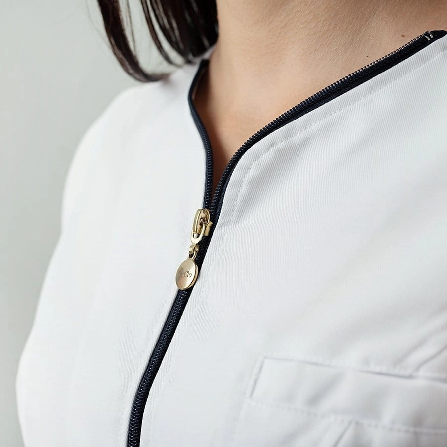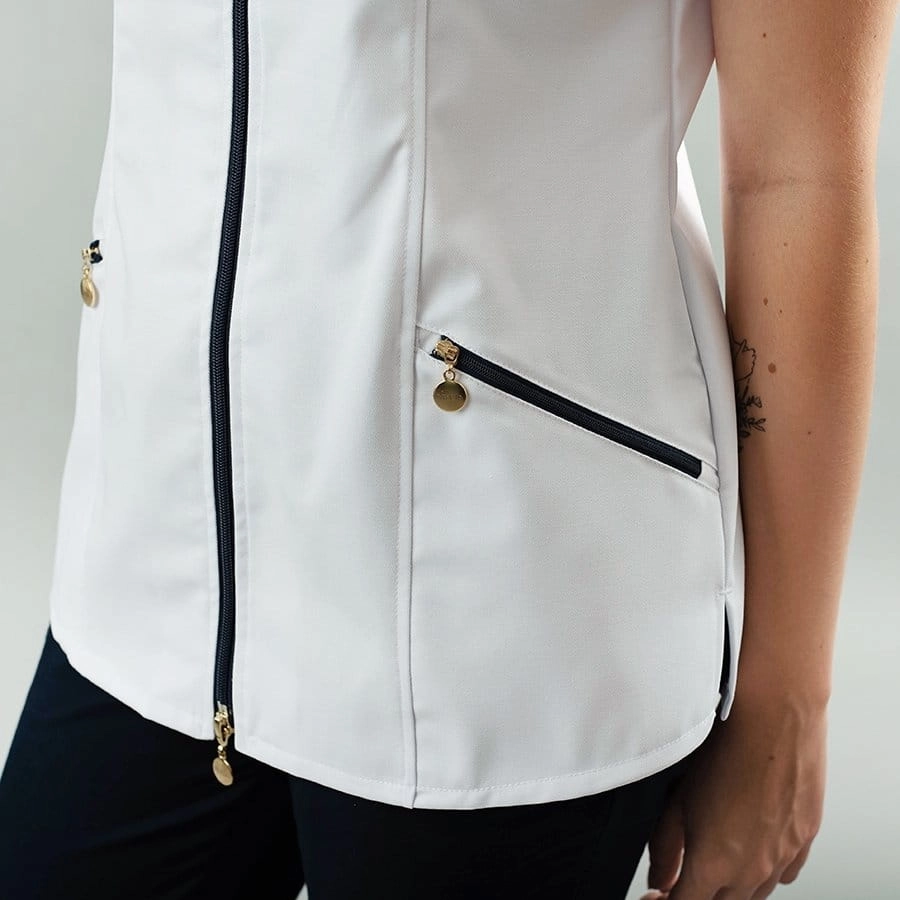 Bluza z krótkim rękawem, zapinana na praktyczny zamek ,,góra-dół’’, wyposażona jest w dwie funkcjonalne kieszenie zapinane na suwak umieszczone na wysokości bioder oraz jedną kieszonkę na górze po lewej stronie. Posiada klasyczny, lekko taliowany krój, podkreślający kobiecą sylwetkę.