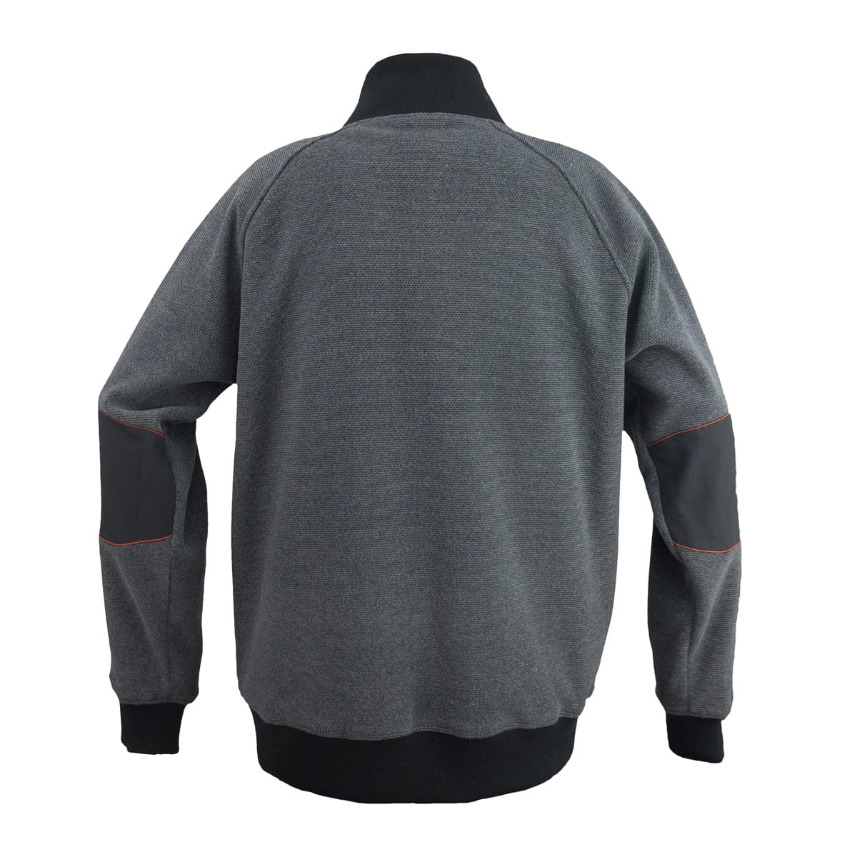 Wygodna bluza robocza w kolorze ciemnym szarym, z kontrastowymi wstawkami w kolorze czarnym na makietach, przy stójce oraz ściągaczu na dole. Materiał na łokciach wzmocniony i obszyty kontrastową nicią w kolorze pomarańczowym. Zamek z wykończeniem w kolorze pomarańczowy. Bluza zapewnia wysoki komfort termiczny w chłodne dni.