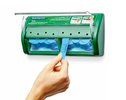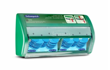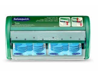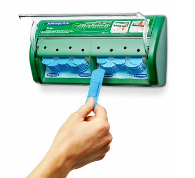 Automat na plaster Salvequick Blue Detectable jest zwłaszcza przeznaczony do użytku w przemyśle spożywczym. Plastry są wykrywalne przez większość wykrywaczy metalu. Dzięki niebieskiemu kolorowi plastry jest łatwo dostrzec. Podczas wyciągania plastra z automatu odkleja się jedna z osłonek, dzięki czemu plaster można przykleić na ranę jedną ręką. Automat uzupełnia się w szybki i prosty sposób za pomocą specjalnego klucza. Przezroczysta pokrywka chroni przed kurzem. Oczyścić ranę, upewnić się, że nie ma zakażenia i zmieniać plaster codziennie
