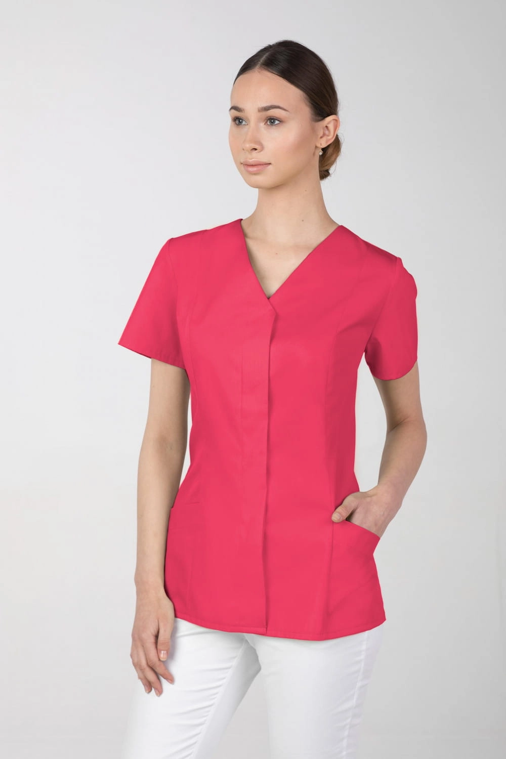 Krótki fartuch medyczny damski zapinany na na kryte napy.