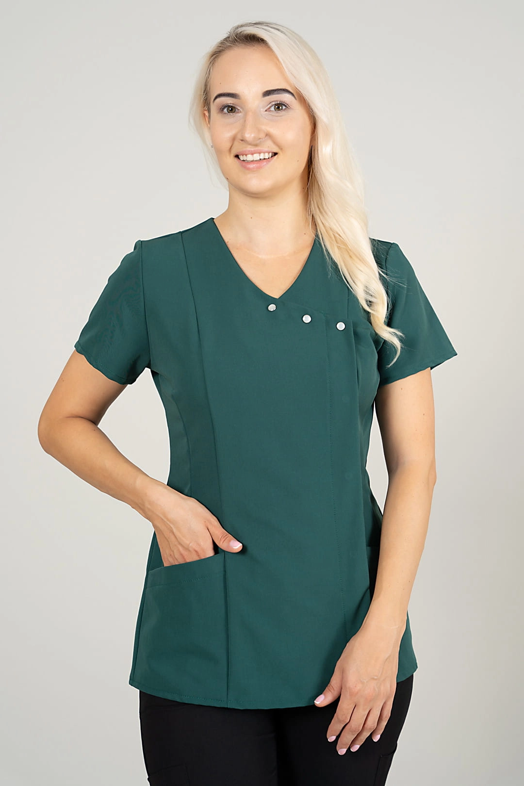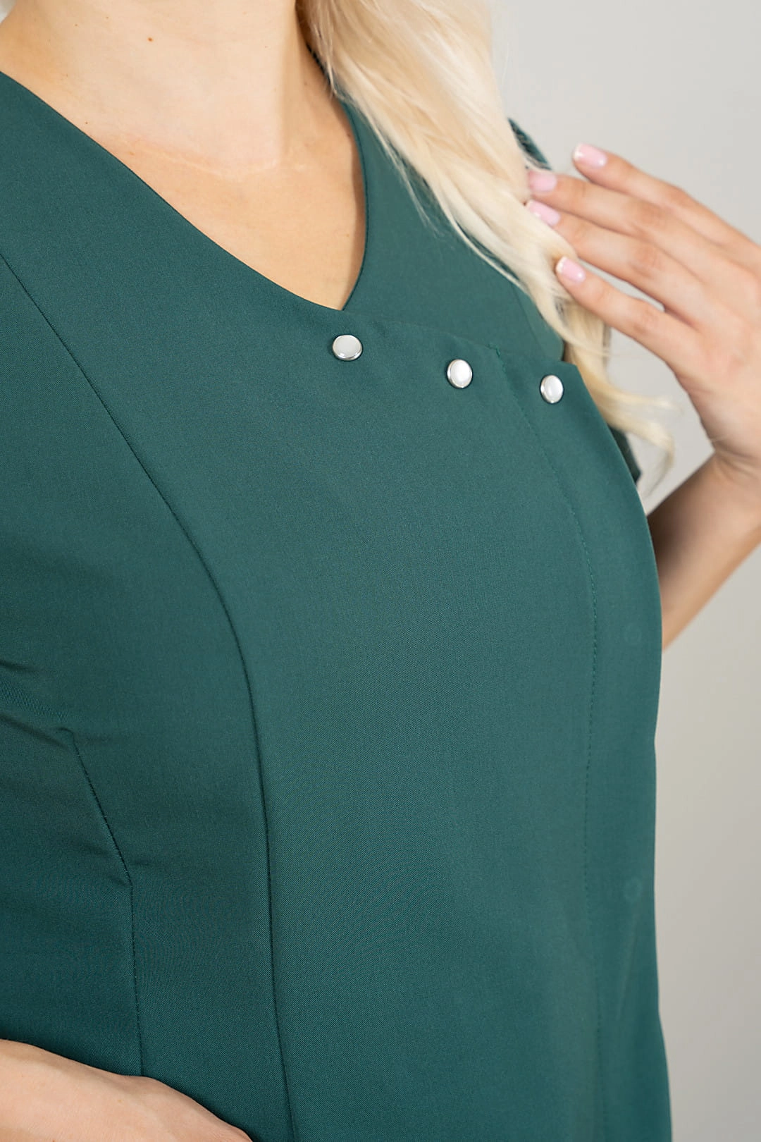 Stylowy i funkcjonalny żakiet medyczny, który zapewnia wygodę i elegancki wygląd przez cały dzień pracy. Taliowany krój podkreśla sylwetkę, a długość gwarantuje komfort noszenia. Dodatkowym atutem są trzy ozdobne napy przy dekolcie, zdobione masą perłową, które nadają subtelnej elegancji.