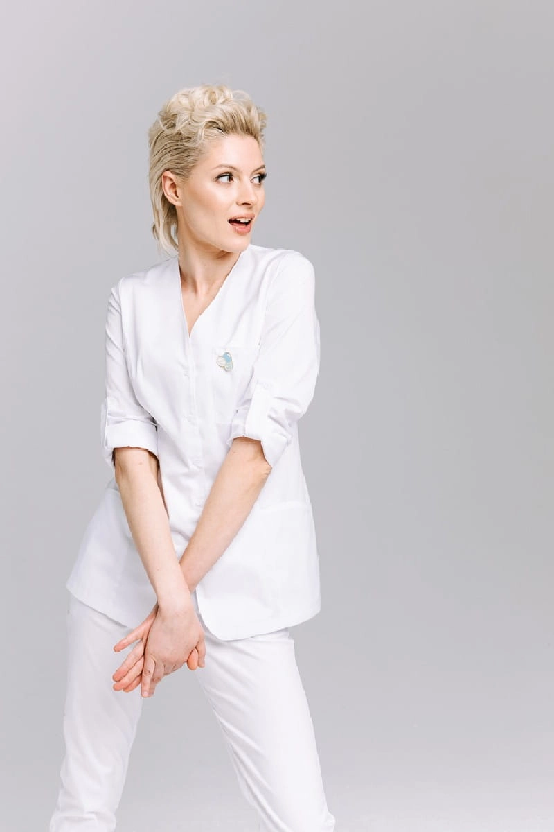 Dekolt w literę V podkreśla delikatnie i wydłuża szyję. Fartuch zapinany na napy, posiada praktyczne kieszenie. Strój jest bardzo wygodny i praktyczny. Model jest doskonale dopasowany do kobiecego ciała.
