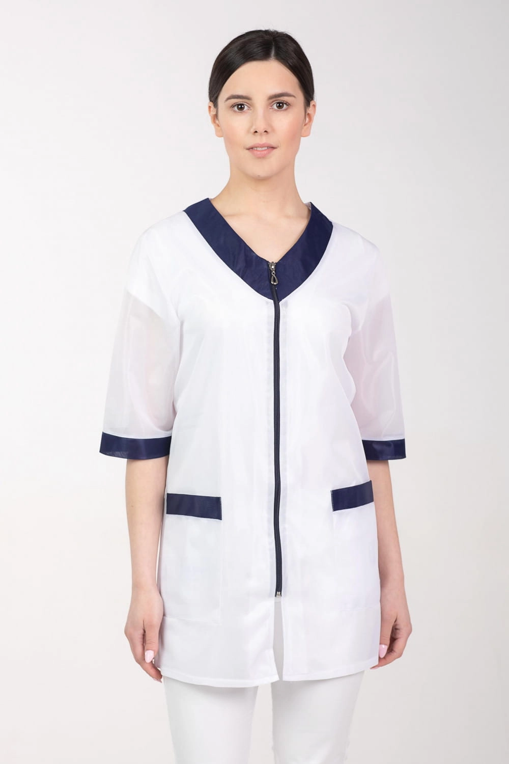 Fartuszek ochronny damski z krótkim rękawem. Bardzo wygodny krój zapinany na zamek. Posiada dwie duże kieszenie boczne, bardzo przydatne podczas pracy. Fartuch występuje w kolorze białym z ozdobnymi wstawkami w kolorze granatowym.