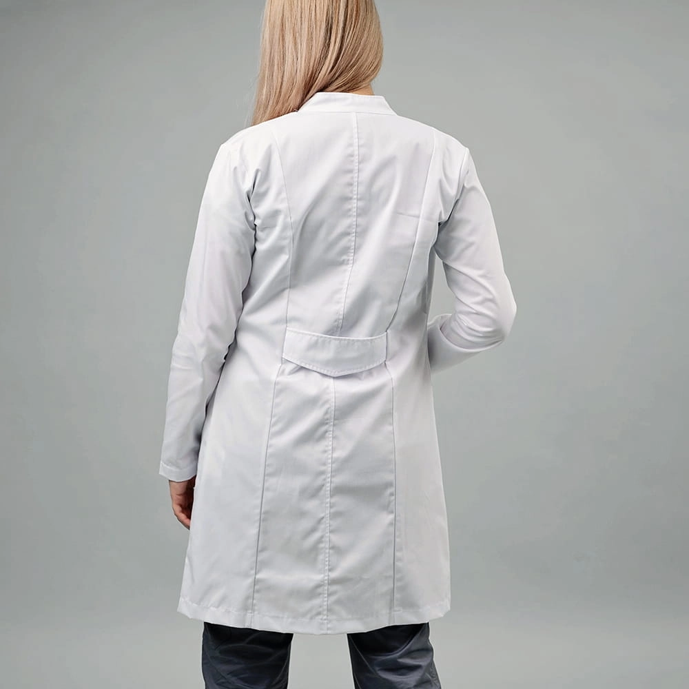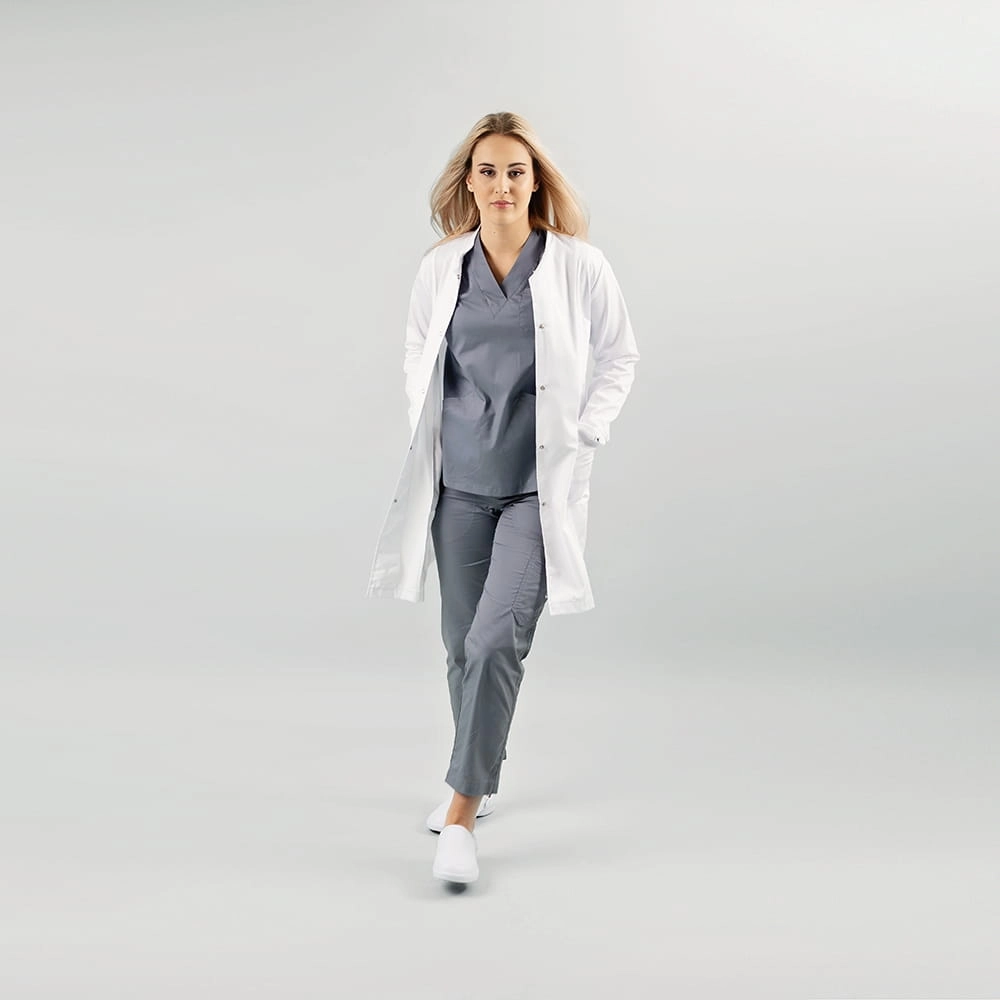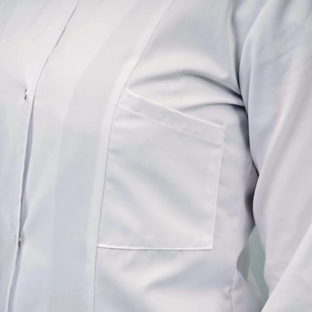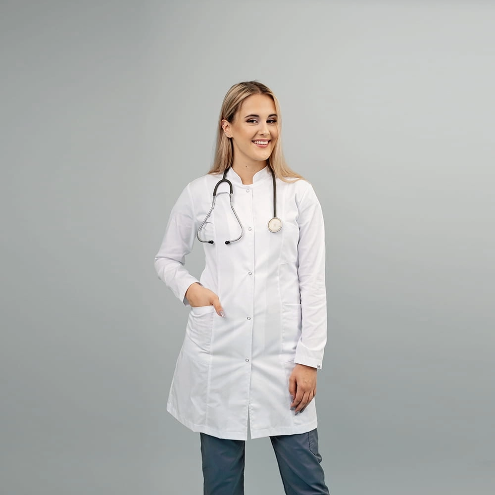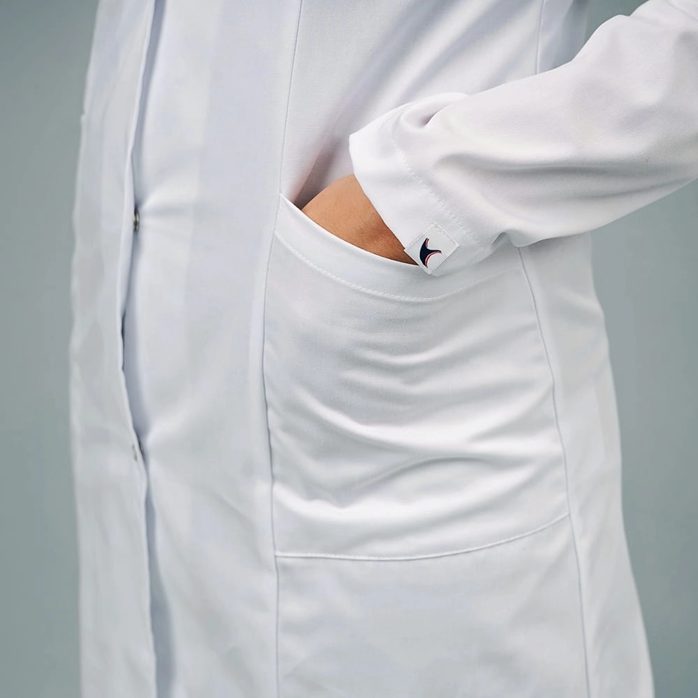 Fartuch damski KOBE o klasycznym kroju, subtelnie podkreślającym kobiecą sylwetkę ,zapinany jest na praktyczne i wygodne napy, dzięki czemu zdejmowanie i zakładanie fartucha jest szybkie i łatwe. Wyposażony w praktyczne kieszenie (dwie na wysokości bioder i jedna na piersi) , niezbędne podczas codziennego użytkowania. Fason z długim rękawem i kołnierzykiem na stójce jest wykonany z wysokogatunkowej, trwałej tkaniny. Model KOBE został stworzony z myślą o kobietach, delikatnie podkreśla figurę i jest wygodny. Doskonale się sprawdzi w zawodach medycznych, branży beauty i SPA