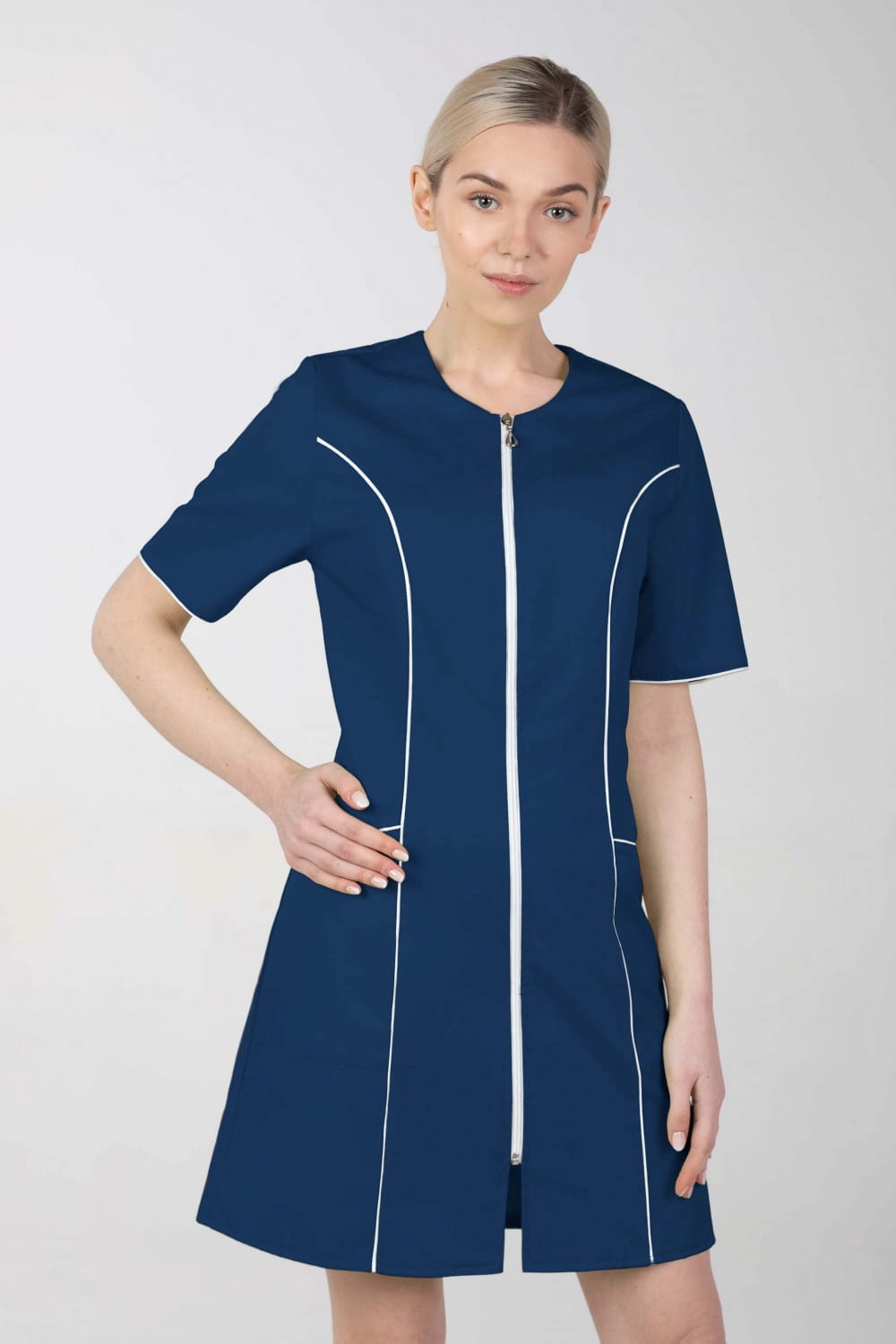 Wygodny krój podkreślający kobiecą sylwetkę, zasuwany na trwały zamek. Fartuch posiada również dwie duże kieszenie boczne, bardzo przydatne podczas pracy. Fartuch wykończony elegancką lamówką.