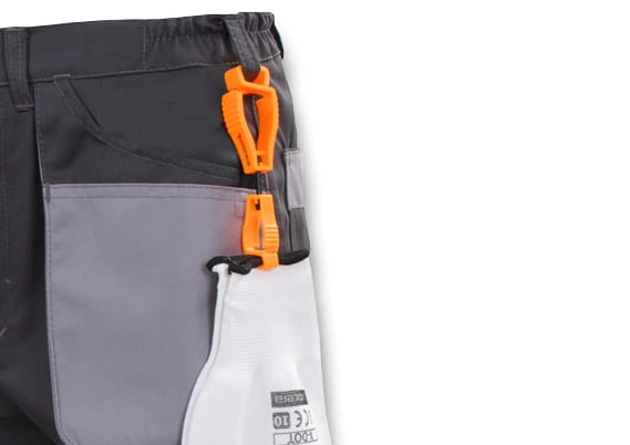 Klips z podwójnym zaczepem do przypięcia rękawic do spodni.