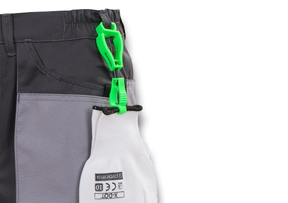 Klips z podwójnym zaczepem do przypięcia rękawic do spodni.