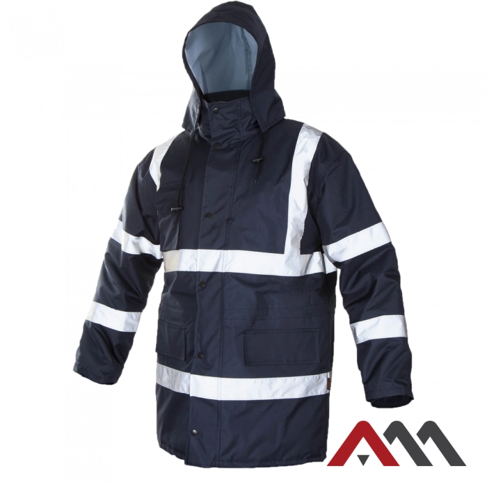 Ocieplana kurtka ochronna wykonana z wodoodpornego materiału 300D poliester Oxford , impregnowanegoPU, w kolorze granatowym, poliestrowej ociepliny, od wewnątrz wykończona poliestrową pikowaną podszewką.