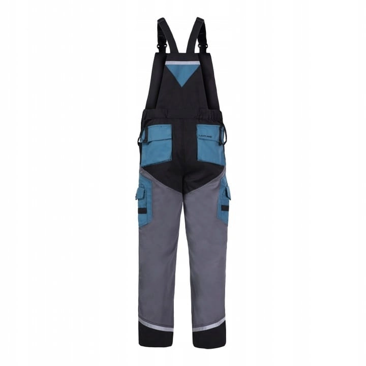Ogrodniczki wykonano z materiału o gramaturze 270g/m2 w kolorze czarno-szaro-turkusowym z pasami odblaskowymi poprawiającymi widoczność pracownika podczas pracy.