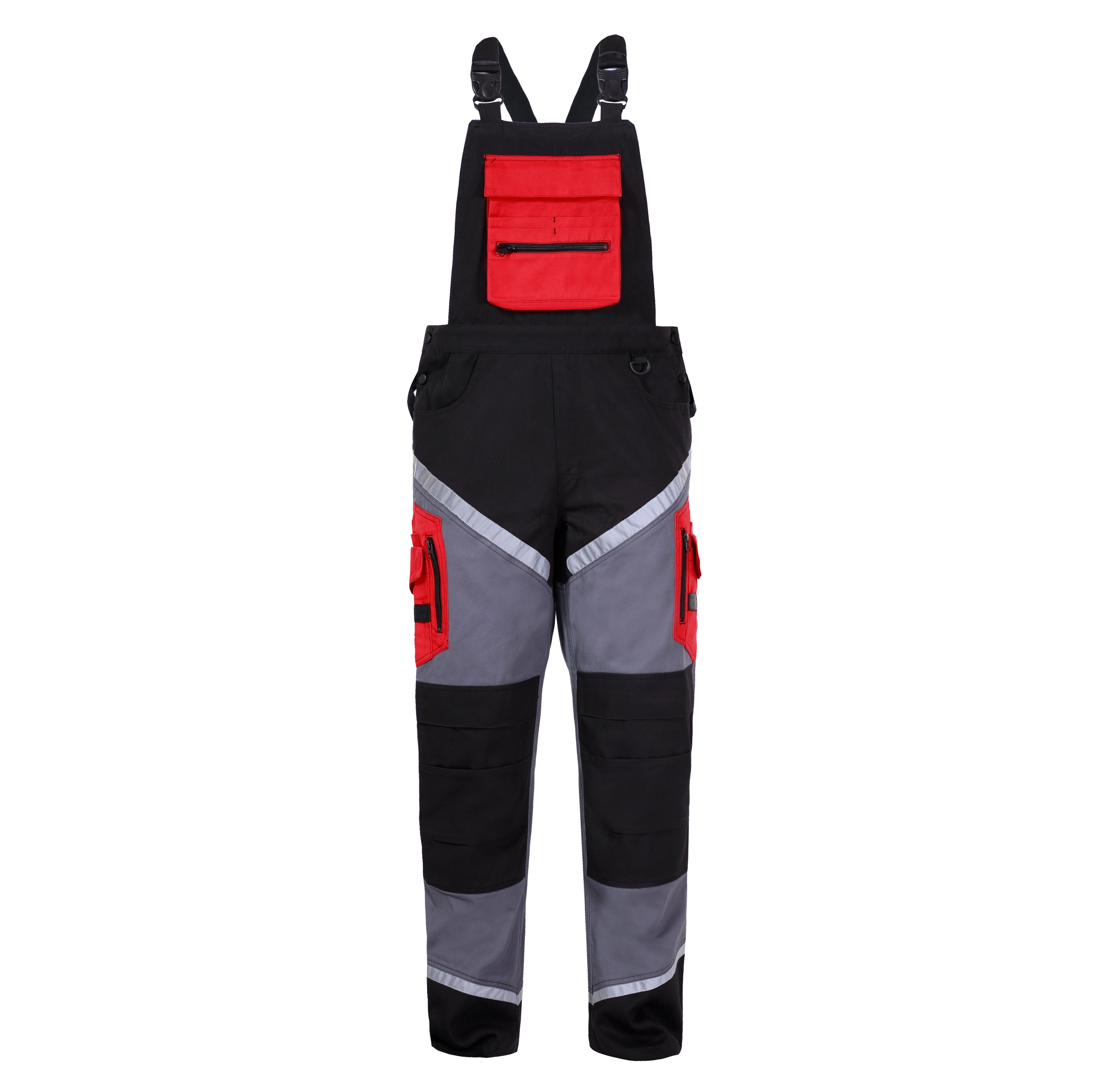 - 18 kieszeni, w tym 3 zamykane na suwak. Kieszeń na telefon komórkowy. Otwory wentylacyjne w kroku zwiększające cyrkulację powietrza. Pasy odblaskowe zwiększające bezpieczeństwo podczas pracy. Potrójne szwy