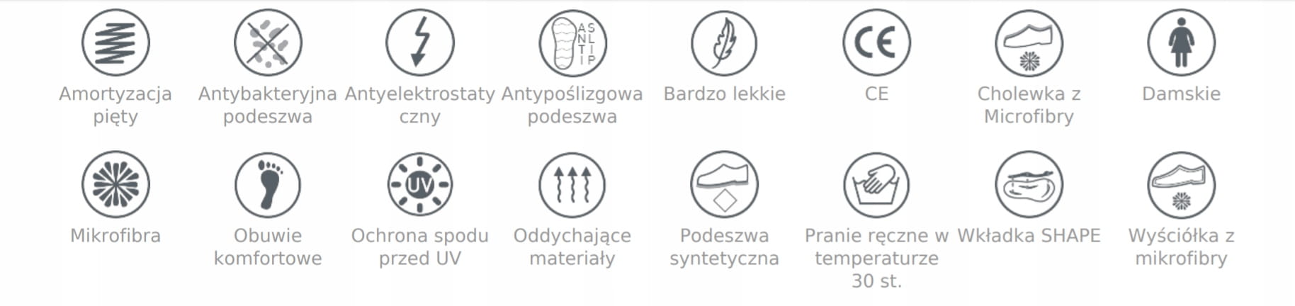 Stabilna, ergonomiczna i komfortowa podeszwa. Dodatkowe zabezpieczenia antypoślizgowe na spodzie podeszwy. Ochrona UV zabezpiecza przed zżółknięciem spodu. Wkładki SHAPE to maksymalny komfort, miękkość, amortyzacja i dopasowanie do kształtu stopy. Odczucie komfortu przez wiele godzin użytkowania obuwia. NOWOŚCIĄ są podszewki i wyściółki z Microfibry. Nie alergizują, nie powodują odparzeń skóry, są odporne na ścieranie, wilgoć i przykre zapachy. Obuwie wykonane z Microfibry można myć pod bieżącą wodą za pomocą miękkiej szczotki lub gąbki. Po umyciu obuwie należy pozostawić do całkowitego wysuszenia w przewiewnym miejscu.