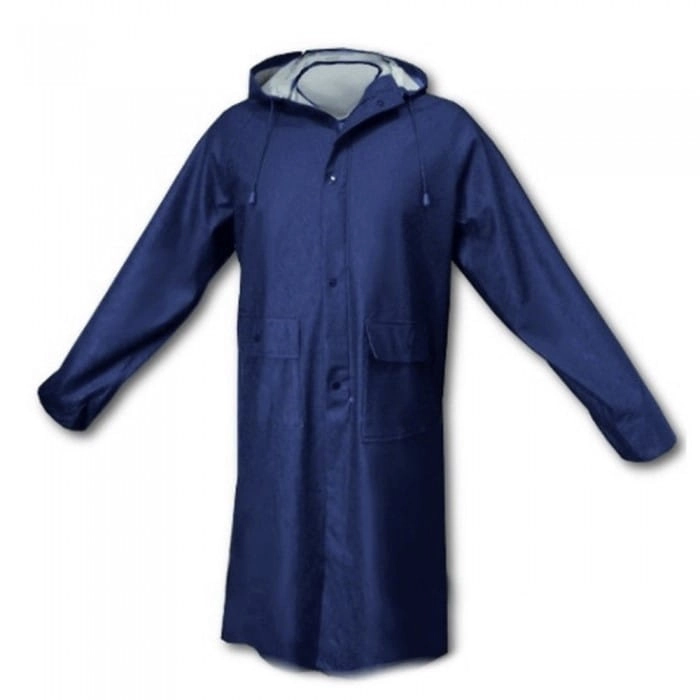 Wysokiej jakości płaszcz przeciwdeszczowy z kapturem z elastycznego materiału o wysokiej wytrzymałości w kolorze niebieskim.