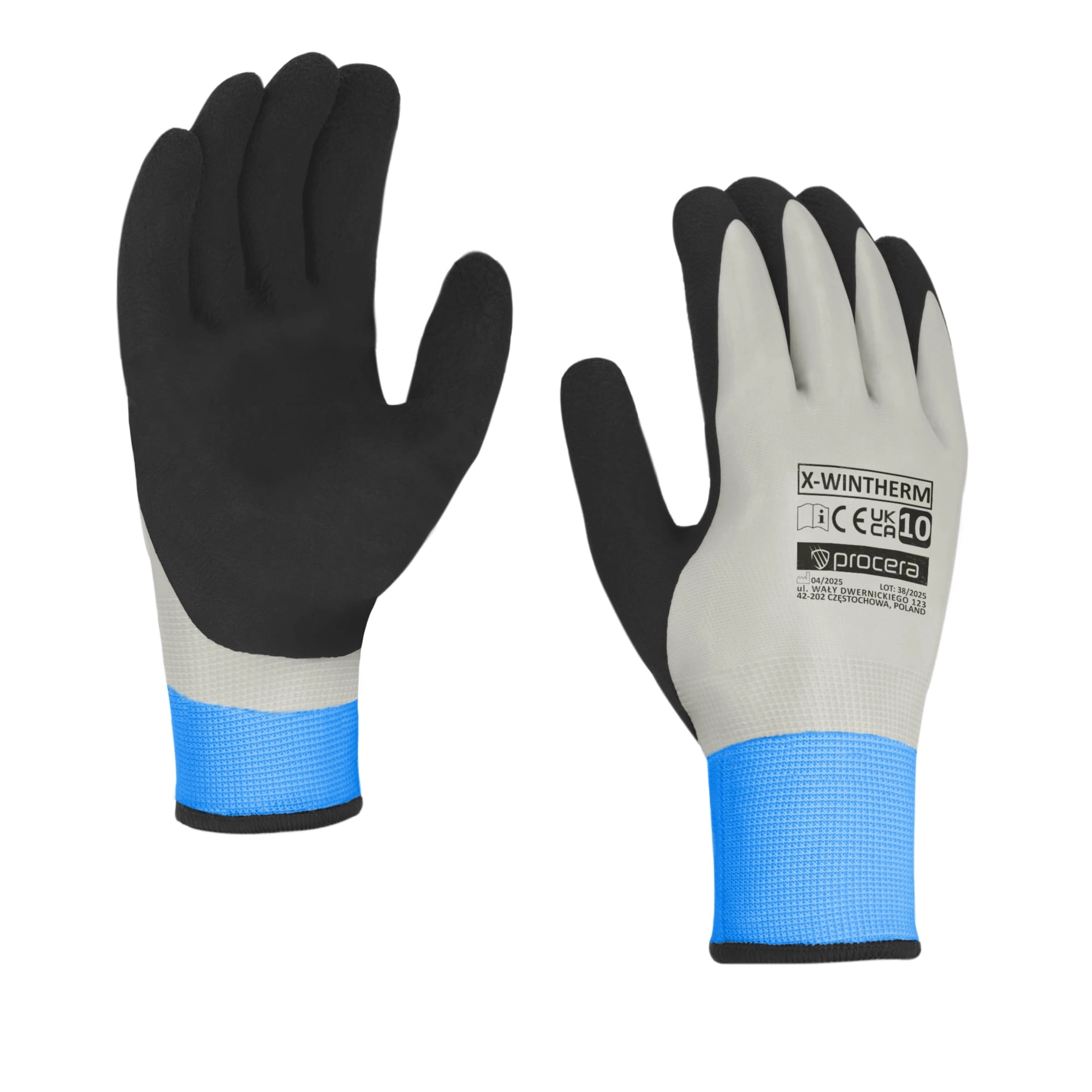 Rękawice poliestrowe dzianinowe, ocieplane, drapane od wewnątrz, z dwuwarstwowym pokryciem lateksowym. Pokrycie części wewnętrznej i zewnętrznej dłoni warstwą gładkiego lateksu w kolorze szarym. Pokrycie części wewnętrznej dłoni lateksem w kolorze czarnym o piaskowej strukturze.