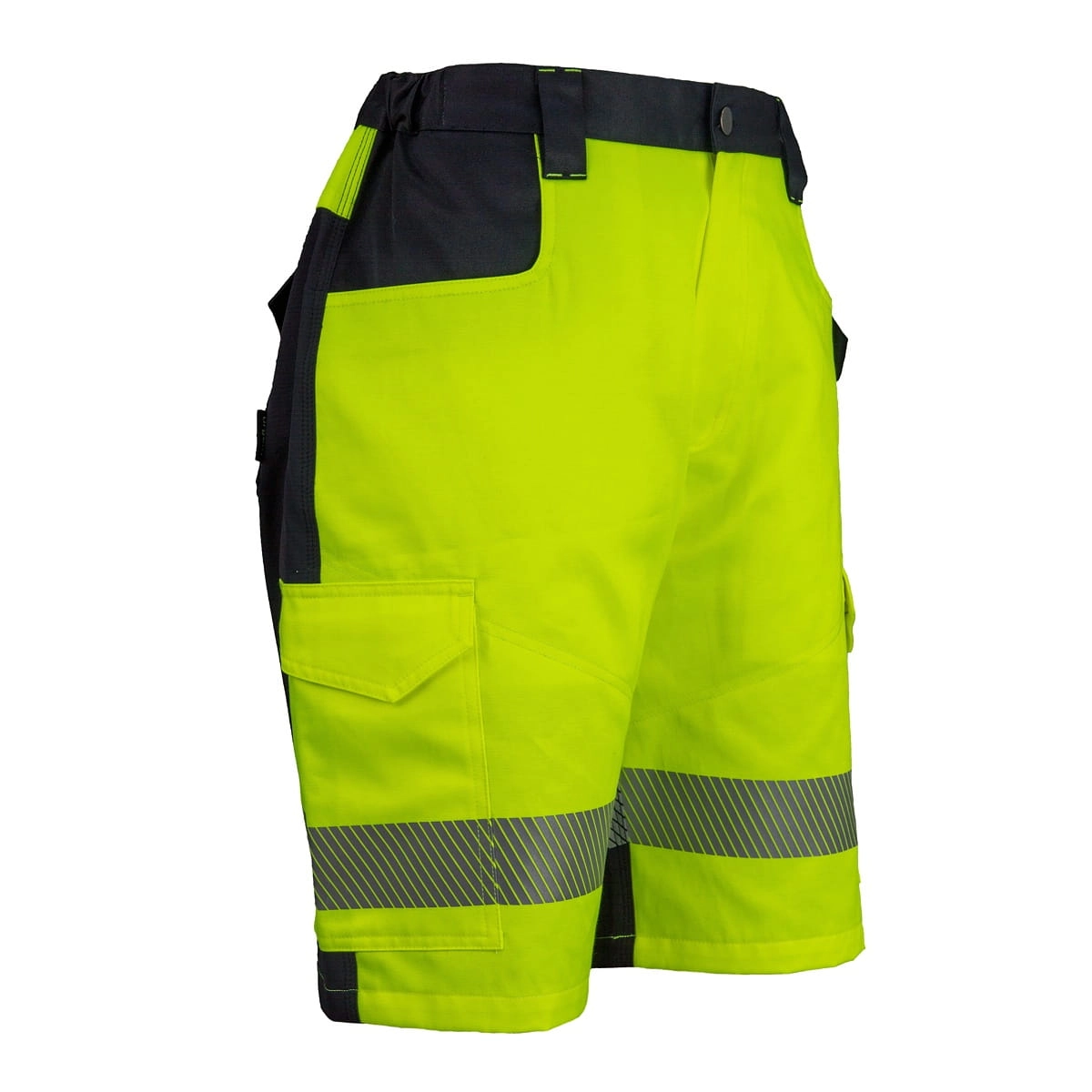 Lekki i elastyczne spodenki robocze wykonane z połączenia dwóch materiałów. Materiał główny o składzie 65% poliester, 35% bawełna i gramaturze 250 g/m2. Tył spodenek wykonany został z elastycznej tkaniny stretch. Żółto-czarny kolor zapewnia dobrą widoczność, dodatkowo w spodenkach zastosowano termo transferowalne pasy odblaskowe.