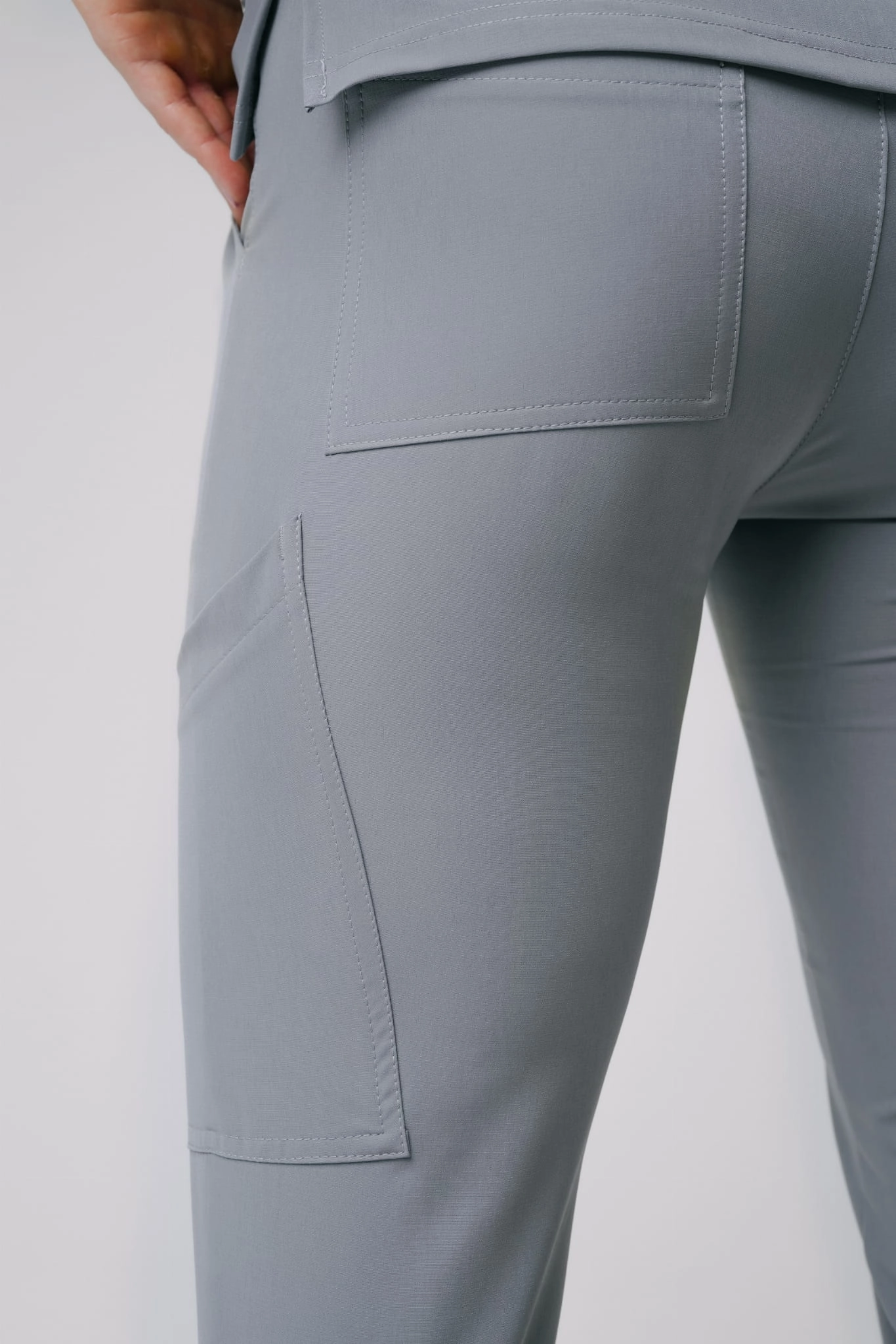 Spodnie wykonane z lekkiego i elastycznego w czterech kierunkach materiału. Tkanina w dotyku jest lejąca i chłodnego co sprawdza się idealnego na ciepłe dni. Posiadają sześć kieszeni, gumę i sznurek w pasie. Kieszenie mają skośny kształt a przy tym są duże, tak aby zmieścić bez problemu stetoskop czy smartfona. Każda kieszeń zabezpieczona jest specjalistycznymi ryglami. Guma w pasie jest bardzo rozciągliwa. Ozdobny sznurek z metalowymi końcówkami przyszyty z tyłu do paska, zapobiega wypadaniu sznurka. Wygląd spodni dopełniają detale w postaci przeszycia na kieszeniach oraz przy dolnych gumach.