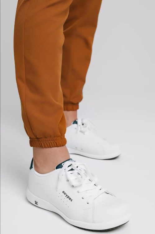 Spodnie wykonane z lekkiego i elastycznego w czterech kierunkach materiału. Tkanina w dotyku jest lejąca i chłodnego co sprawdza się idealnego na ciepłe dni. Posiadają sześć kieszeni, gumę i sznurek w pasie. Kieszenie mają skośny kształt a przy tym są duże, tak aby zmieścić bez problemu stetoskop czy smartfona. Każda kieszeń zabezpieczona jest specjalistycznymi ryglami. Guma w pasie jest bardzo rozciągliwa. Ozdobny sznurek z metalowymi końcówkami przyszyty z tyłu do paska, zapobiega wypadaniu sznurka. Wygląd spodni dopełniają detale w postaci przeszycia na kieszeniach oraz przy dolnych gumach.