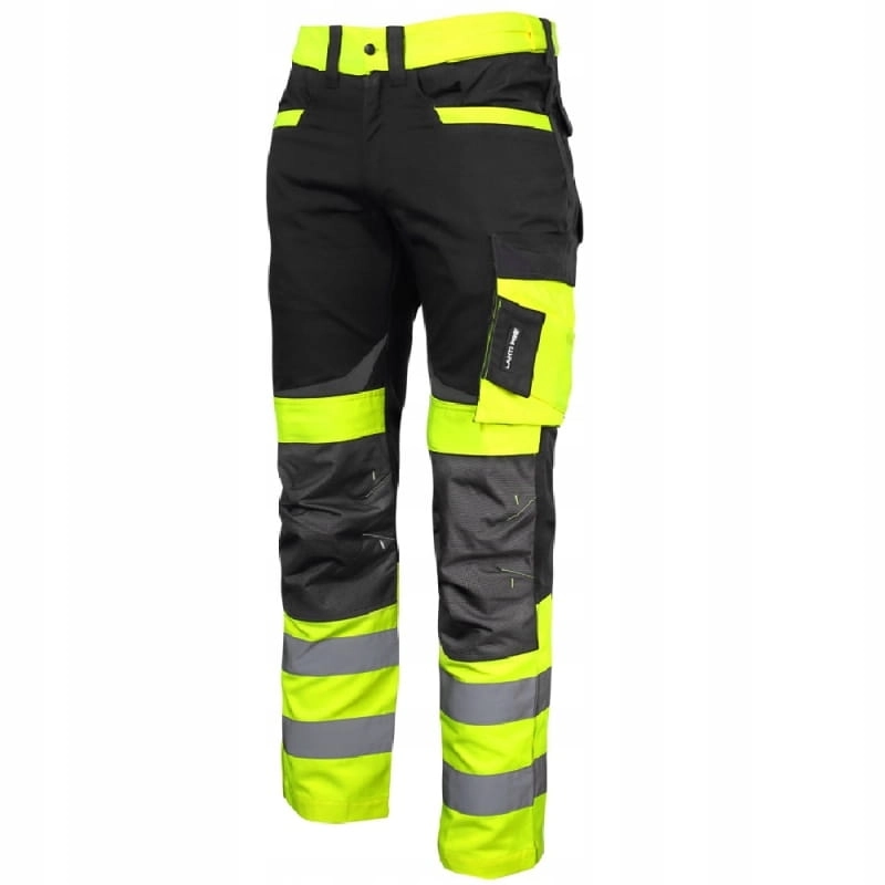 Wytrzymałe i funkcjonalne spodnie robocze w kolorze żółto-czarnym z pasami odblaskowymi. Nowoczesny krój slim fit z niezawodną trwałością.