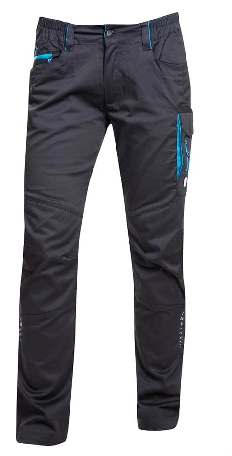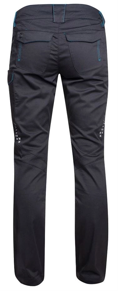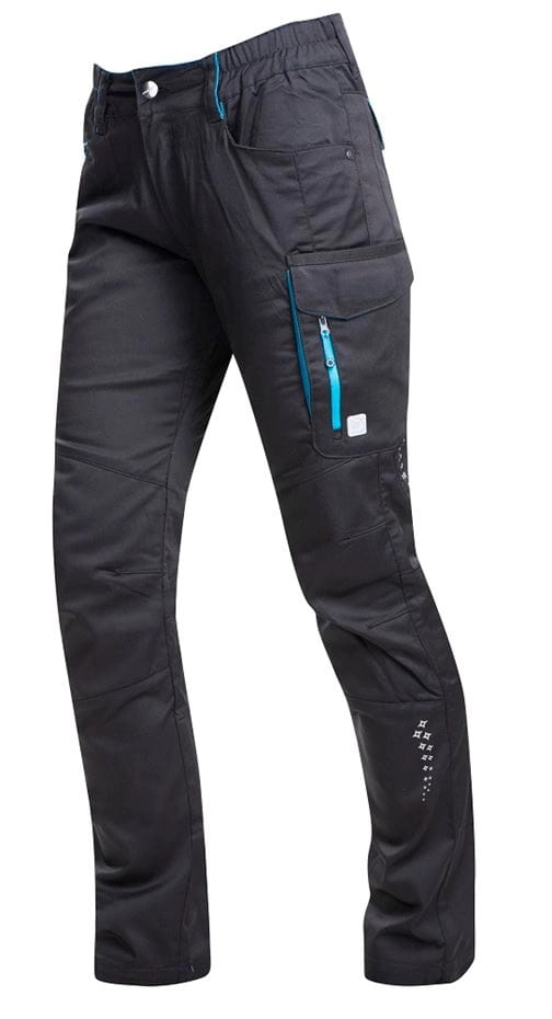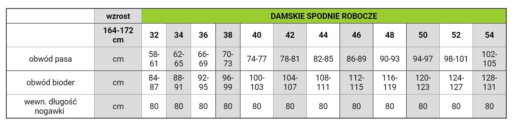 Damskie spodnie robocze, ergonomiczny fason, anatomiczne profilowanie kolana, elastyczny materiał. Przednie kieszenie przelotowe, tylne kieszenie kryte plisą, boczna wielofunkcyjna podwójna kieszeń, kieszonka z suwakiem w części przedniej. Podwyższony pas w części tylnej, elastyczny pas, elementy odblaskowe, podwójna zakładka - możliwość wydłużenia długości nogawek nawet o 5 cm.