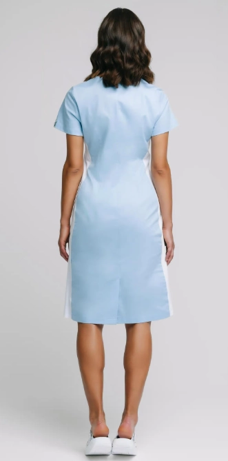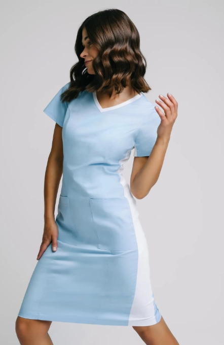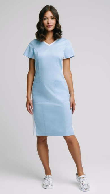 Sukienka medyczna Klara to nowoczesna propozycja dla kobiet pracujących w przychodniach, szpitalach oraz gabinetach lekarskich. Wygodny krój prostej, klasycznej sukienki ozdobionej ryglami przy każdej kieszeni oraz rozporku. W boki sukienki oraz dekolt wszyte są pasy z dzianiny, dzięki którym sukienka jest przewiewna i elastyczna.