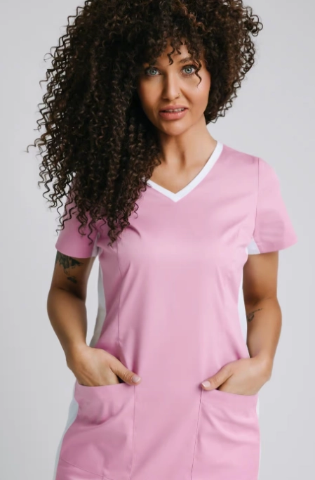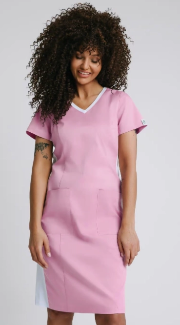 Sukienka medyczna Klara to nowoczesna propozycja dla kobiet pracujących w przychodniach, szpitalach oraz gabinetach lekarskich. Wygodny krój prostej, klasycznej sukienki ozdobionej ryglami przy każdej kieszeni oraz rozporku. W boki sukienki oraz dekolt wszyte są pasy z dzianiny, dzięki którym sukienka jest przewiewna i elastyczna.