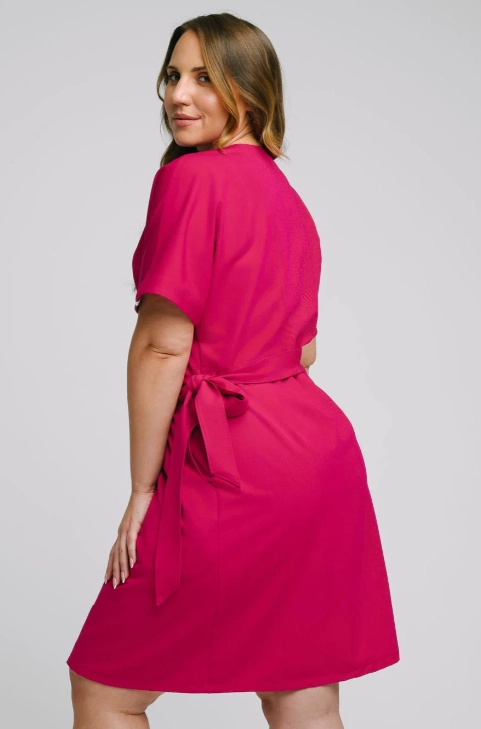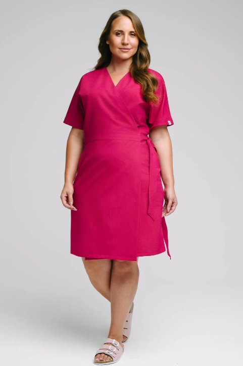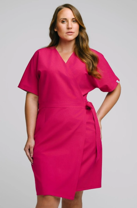 Wiązanie w talii pozwala regulować dopasowanie, dzięki czemu można nadać sukience odpowiedni kształt – bardziej dopasowany lub luźniejszy, w zależności od preferencji. Sukienka posiada krótkie rękawy i kopertowy dekolt zabezpieczony napą. Praktyczne kieszenie umieszczone po bokach pozwalają na wygodne przechowywanie drobnych narzędzi lub akcesoriów.