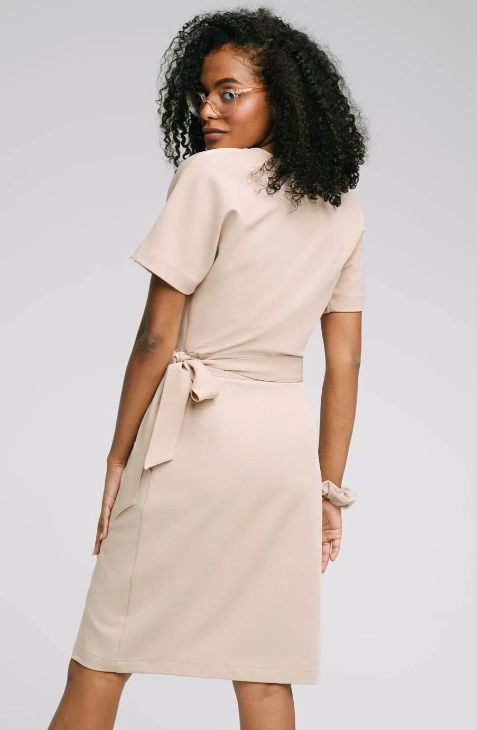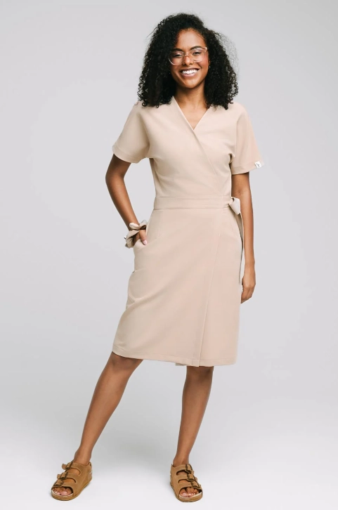 Wiązanie w talii pozwala regulować dopasowanie, dzięki czemu można nadać sukience odpowiedni kształt – bardziej dopasowany lub luźniejszy, w zależności od preferencji. Sukienka posiada krótkie rękawy i kopertowy dekolt zabezpieczony napą. Praktyczne kieszenie umieszczone po bokach pozwalają na wygodne przechowywanie drobnych narzędzi lub akcesoriów.