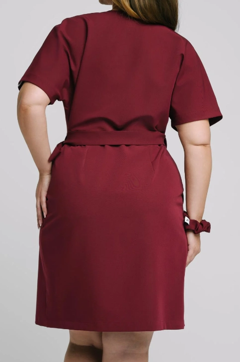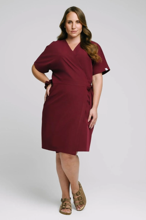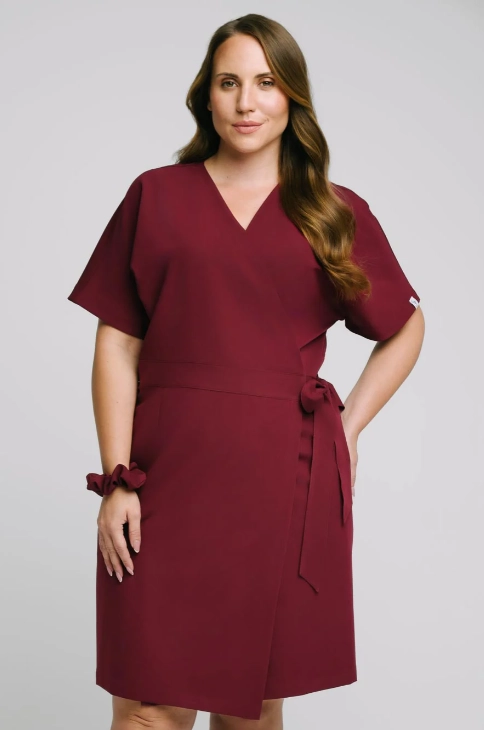 Wiązanie w talii pozwala regulować dopasowanie, dzięki czemu można nadać sukience odpowiedni kształt – bardziej dopasowany lub luźniejszy, w zależności od preferencji. Sukienka posiada krótkie rękawy i kopertowy dekolt zabezpieczony napą. Praktyczne kieszenie umieszczone po bokach pozwalają na wygodne przechowywanie drobnych narzędzi lub akcesoriów.