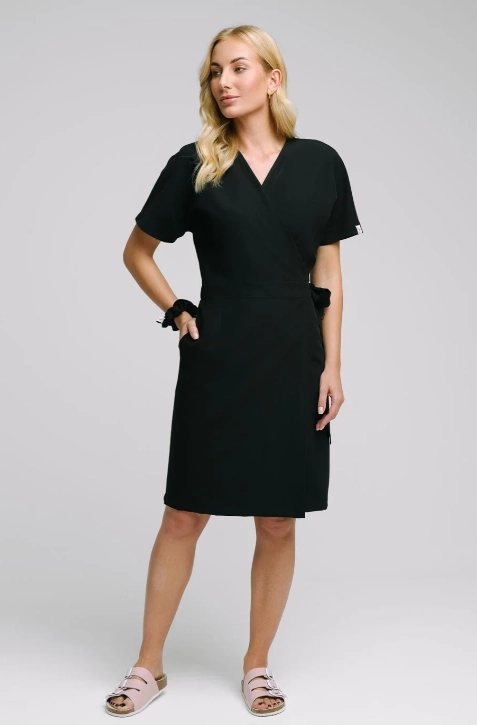 Wiązanie w talii pozwala regulować dopasowanie, dzięki czemu można nadać sukience odpowiedni kształt – bardziej dopasowany lub luźniejszy, w zależności od preferencji. Sukienka posiada krótkie rękawy i kopertowy dekolt zabezpieczony napą. Praktyczne kieszenie umieszczone po bokach pozwalają na wygodne przechowywanie drobnych narzędzi lub akcesoriów.