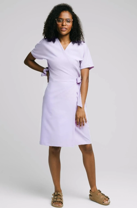 Wiązanie w talii pozwala regulować dopasowanie, dzięki czemu można nadać sukience odpowiedni kształt – bardziej dopasowany lub luźniejszy, w zależności od preferencji. Sukienka posiada krótkie rękawy i kopertowy dekolt zabezpieczony napą. Praktyczne kieszenie umieszczone po bokach pozwalają na wygodne przechowywanie drobnych narzędzi lub akcesoriów.