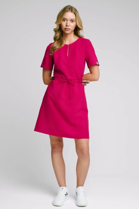 Sukienka jest wkładana przez głowę a dekolt został stylowo wykończony. Wiązanie w tali pozwala regulować stopień dopasowania. Fason sukienki jest delikatnie rozkloszowany, co poprawia komfort kroku i minimalizuje uczucie ciągnięcia materiału przy ruchu. Dwie funkcjonalne kieszenie, zabezpieczone ryglami, umożliwiają bezpieczne przechowywanie najpotrzebniejszych drobiazgów – od telefonu, po stetoskop.