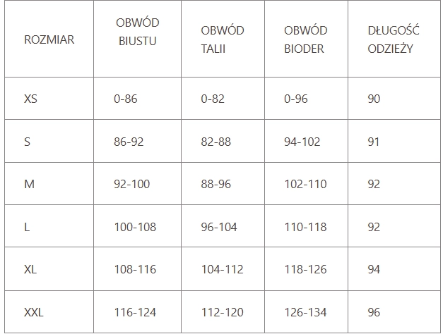 XS - biust 0-86 cm, talia 0-82 cm, biodra 0-96 cm, długość 90 cm