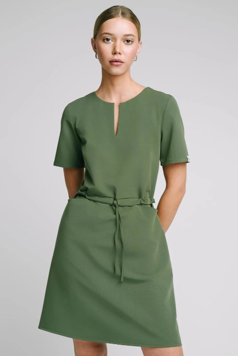 Sukienka jest wkładana przez głowę a dekolt został stylowo wykończony. Wiązanie w tali pozwala regulować stopień dopasowania. Fason sukienki jest delikatnie rozkloszowany, co poprawia komfort kroku i minimalizuje uczucie ciągnięcia materiału przy ruchu. Dwie funkcjonalne kieszenie, zabezpieczone ryglami, umożliwiają bezpieczne przechowywanie najpotrzebniejszych drobiazgów – od telefonu, po stetoskop.