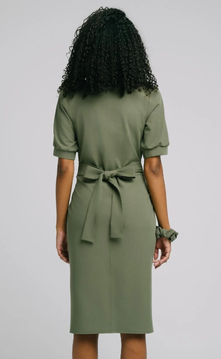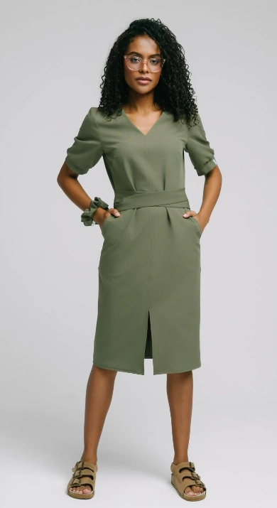 Sukienka w długości midi jest wkładana przez głowę a dekolt został wykończony w literę V. Przód sukienki posiada rozporek w celu zapewnienia wygody podczas chodzenia, wychodzenia po schodach czy siedzenia na krześle. Rozcięcie jest zabezpieczone ryglem. Paski wszyte na bokach sukienki pozwolą zawiązać sukienkę na 2 różne sposoby z przodu lub z tyłu. Sukienka posiada dwie duże kieszenie usytuowane na biodrach. Rękawki zakończone zostały delikatnym marszczeniem.