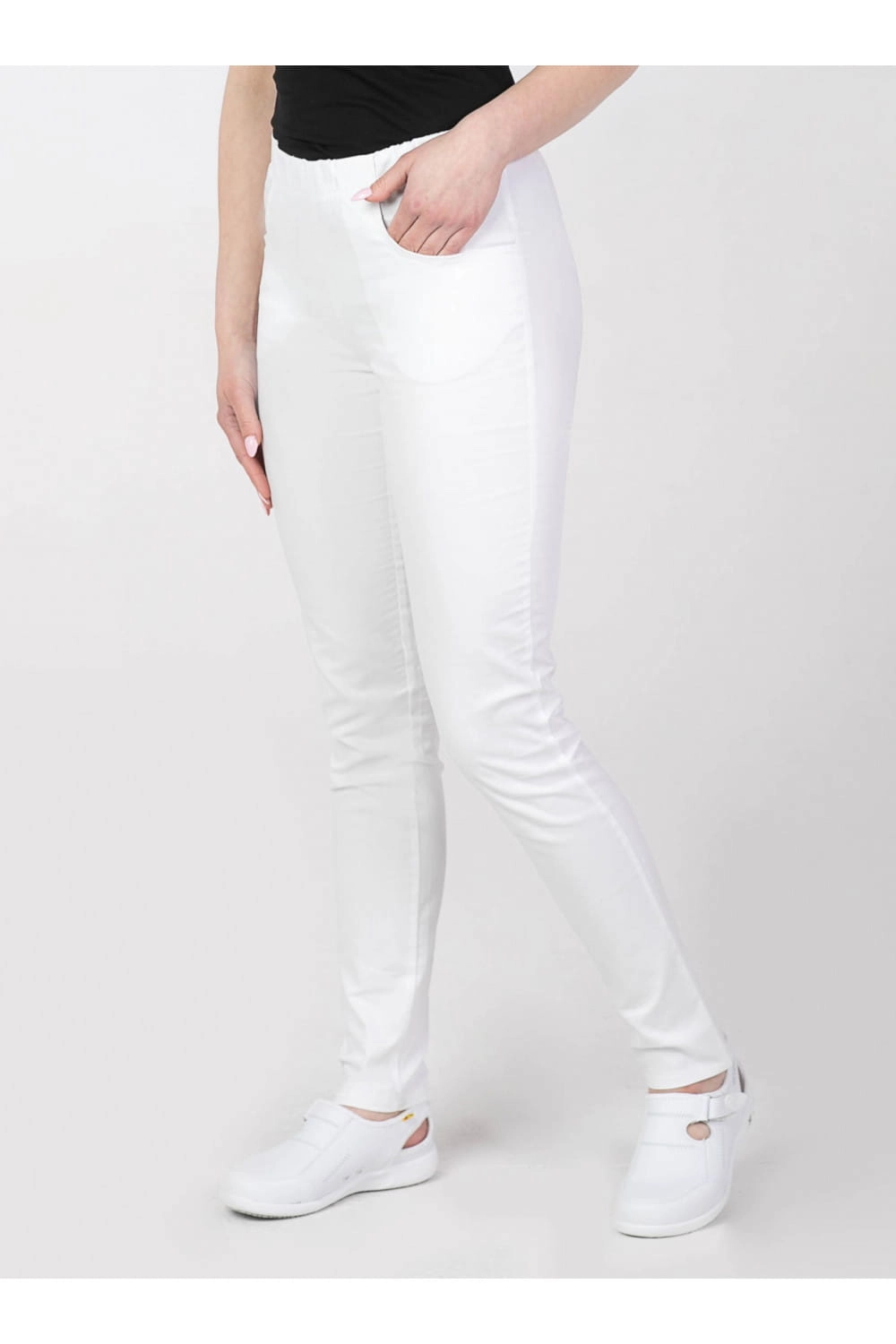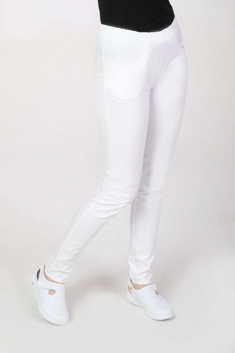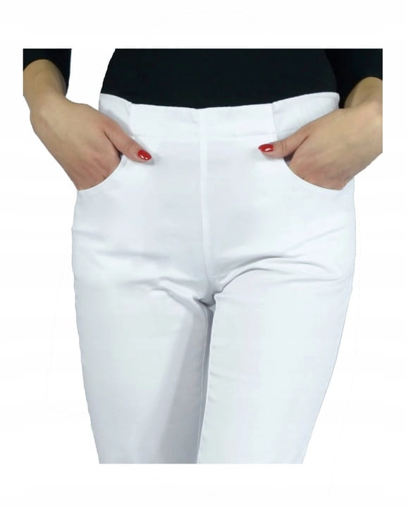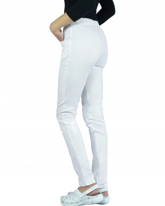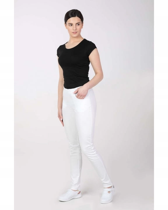 Damskie spodnie medyczne z wąskimi nogawkami. W pasie guma, dwie kieszenie z przodku.