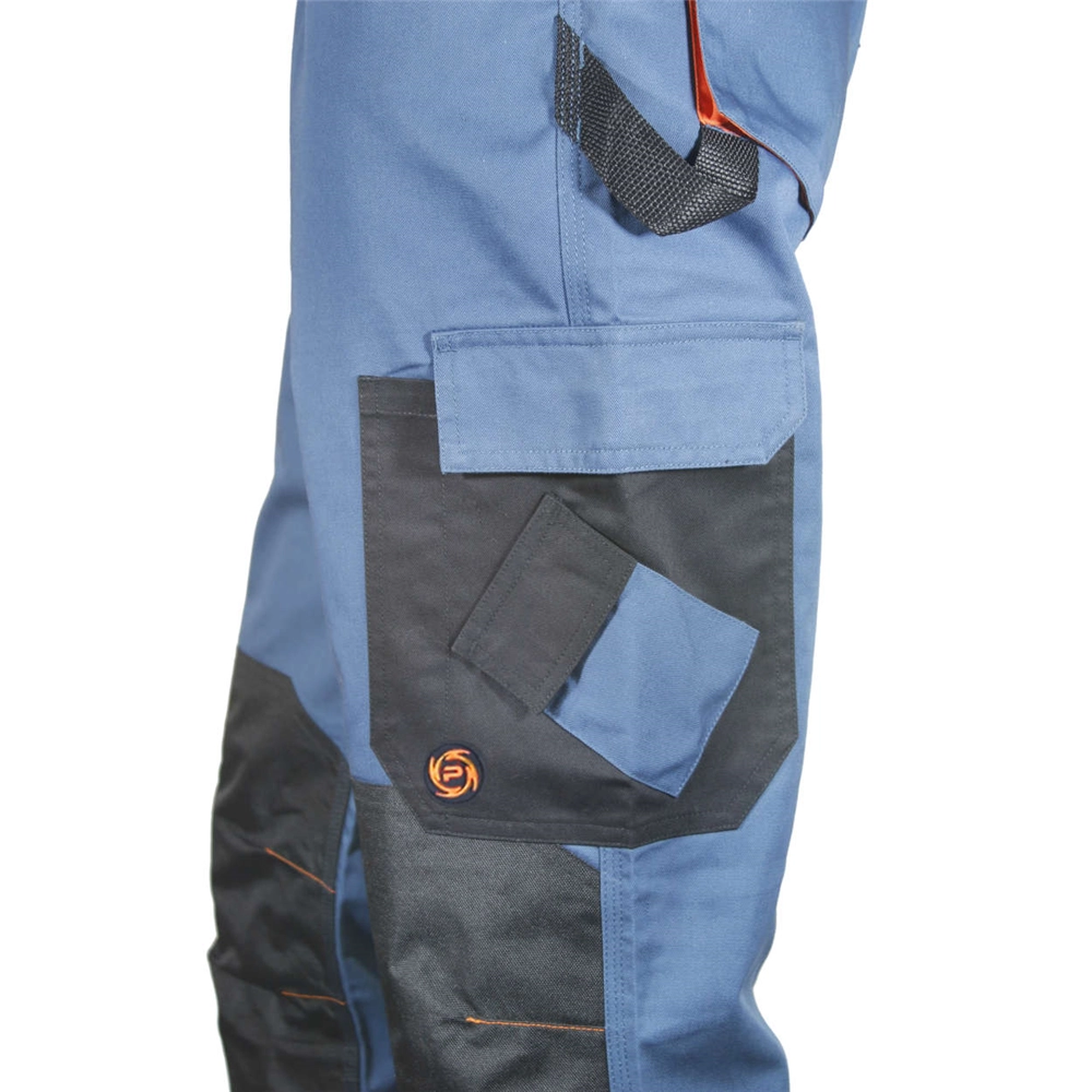 Niebiesko-czarne spodnie zostały wykonane z połączenia bawełny i spandexu dzięki czemu są jednocześnie wytrzymałe i elastyczne. Pozwala to na właściwe dopasowanie odzieży do użytkownika, a w konsekwencji wygodną pracę przez długie godziny. Spodnie skinner posiadają duże, wielofunkcyjne kieszenie oraz specjalne miejsce na nakolanniki, które po zamontowaniu nakolanników jeszcze bardziej zwiększają komfort przy pracy na kolanach. Dodatkowym atutem spodni jest możliwość przedłużenia nogawek (wystarczy wypruć jedną nitkę).