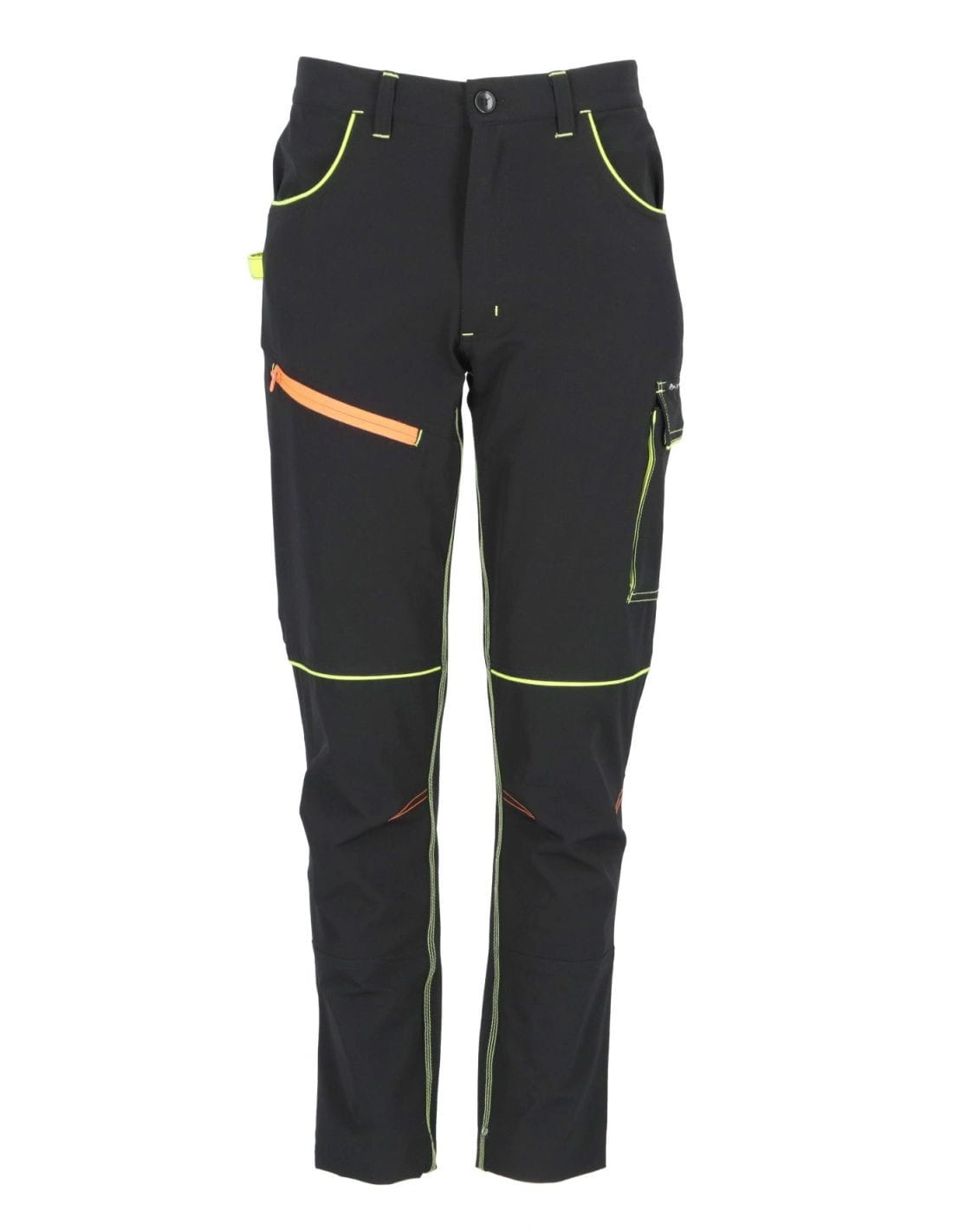 Spodnie ochronne w kolorze czarnym niebrudzącym wraz z estetycznymi pomarańczowymi i żółtymi wstawkami w kieszeniach przestrzennych.
