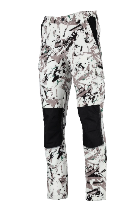 lekkie spodnie robocze z ciekawym i modnie wyglądające wzorem, które krojem nawiązują do spodni trekkingowych.