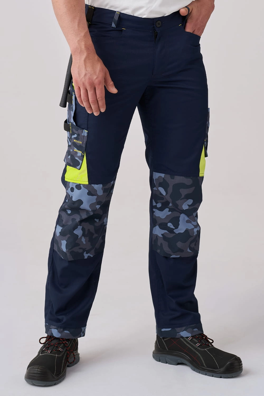 - wygodne spodnie robocze z elementami koloru: moro i fluo