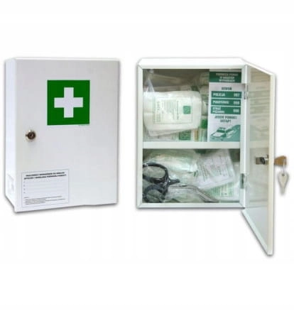 Stalowa apteczka ścienna "30" to metalowa szafka naścienna oraz jej wyposażenie zgodne z normą DIN-131577 (w komplecie zawiera się dodatkowo maseczka do sztucznego oddychania) służące do udzielania pierwszej pomocy. Przeznaczona do zakładów przemysłowych, biur, szkół, instytucji itp. Apteczkę można uzupełniać i wyposażać w dodatkowe produkty w zależności od własnych potrzeb.