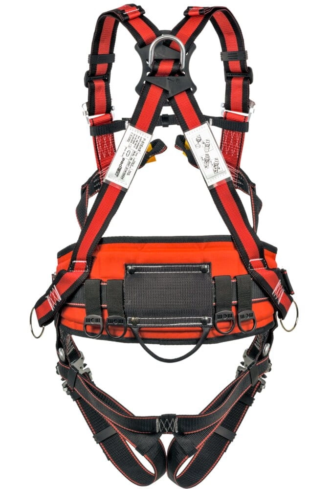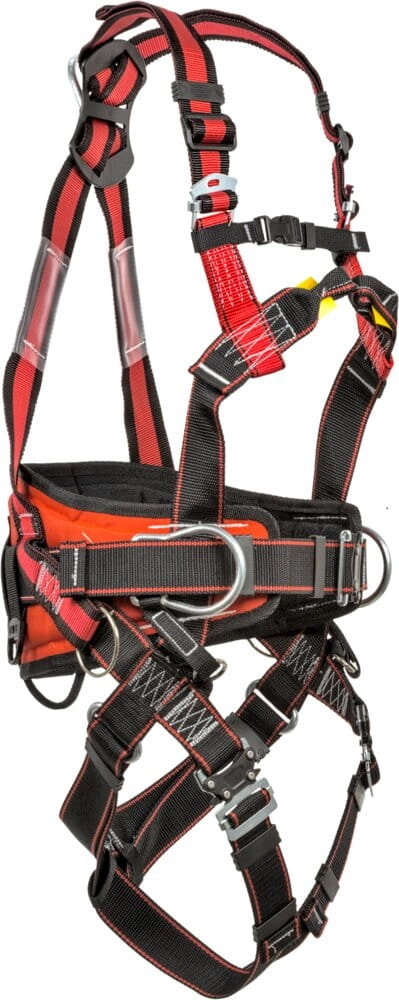 Szelki bezpieczeństwa z 2 elementami zaczepowymi do powstrzymania spadania: tylną klamrą stalową D i przednim elementem zaczepowym w postaci podwójnej pętli. Dodatkowo szelki wyposażone w taśmę zaczepową o dł. 40 cm zamocowaną do tylnej klamry D. Szelki testowane dynamicznie z obciążeniem 140 kg.
