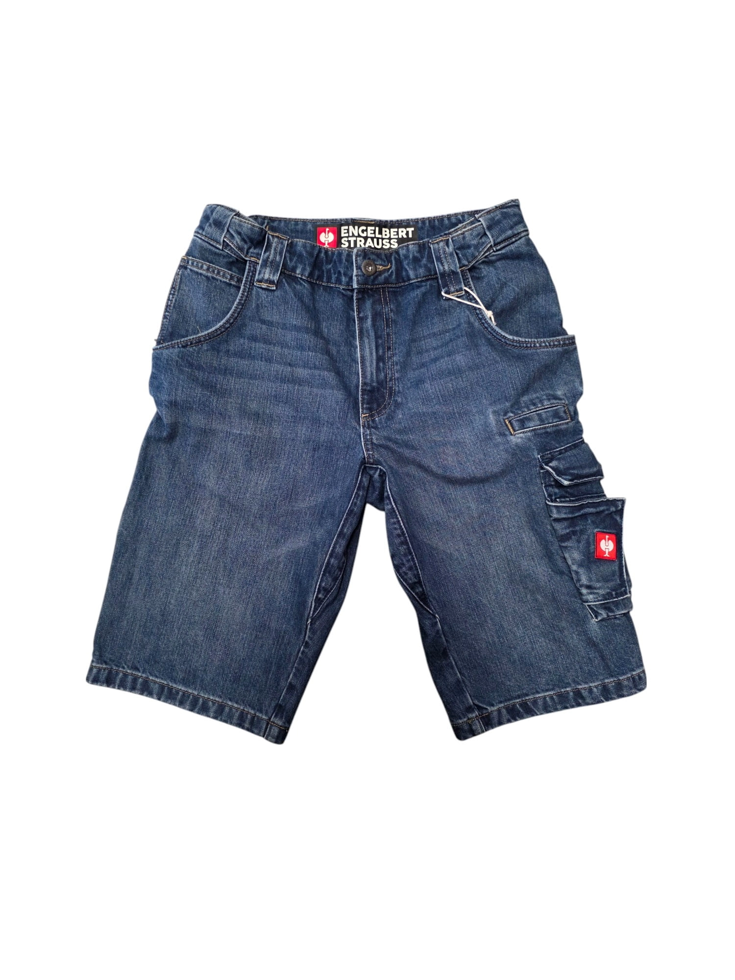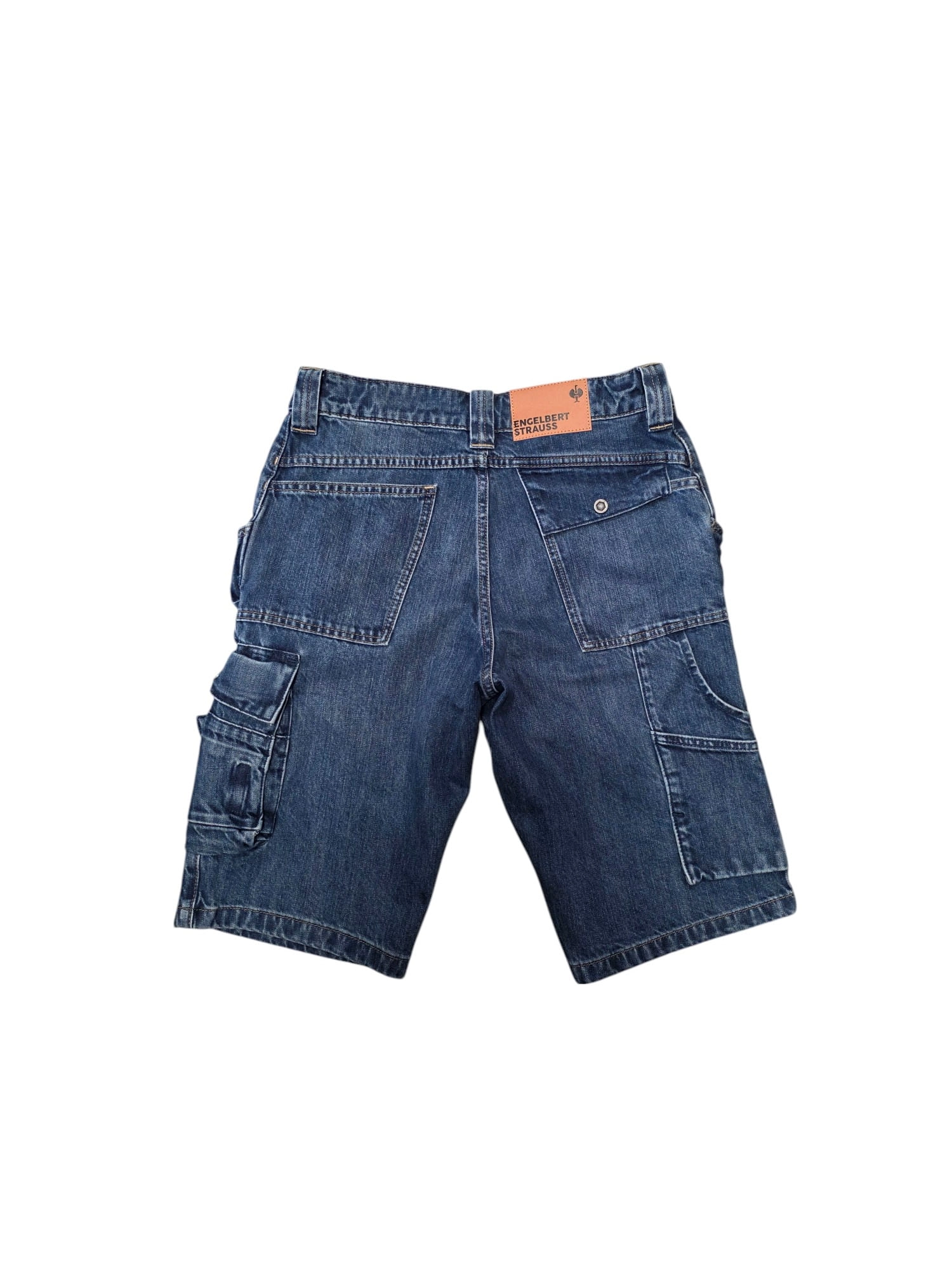 Spodenki robocze wykonane z jeansowego materiału o uniwerslanym kroju cargo z prostymi nogawkami i elastycznym pasem. Zapięcie na guzik i zamek błyskawiczny z podszyciem.