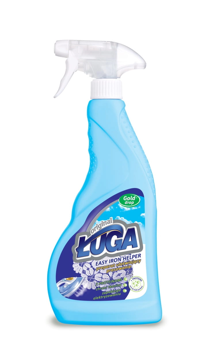Ługa Preparat z proteinami to nowoczesny i niezawodny środek w płynie, ułatwiający prasowanie tkanin takich jak: koszule, obrusy, bluzki, bielizna, firanki.